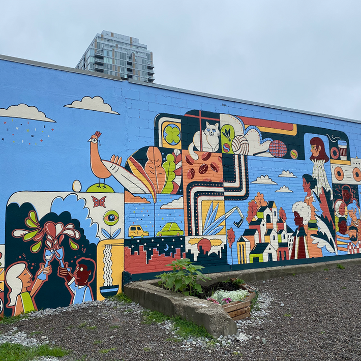 Inspired by the heart of Corktown, this mural highlights the positivity, inclusivity, and diversity of the neighbourhood. It showcases the outgoing, people oriented community using a bold palette. The mural gradually shifts in tone from a working and learning environment to a homely and comfortable feel, representing the daily lives of the members of the community. The mural incorporates numerous elements to form a mosaic of different perspectives coming together. Captured in a playful, colourful manner to reflect both the historical roots and the modern atmosphere of the area.